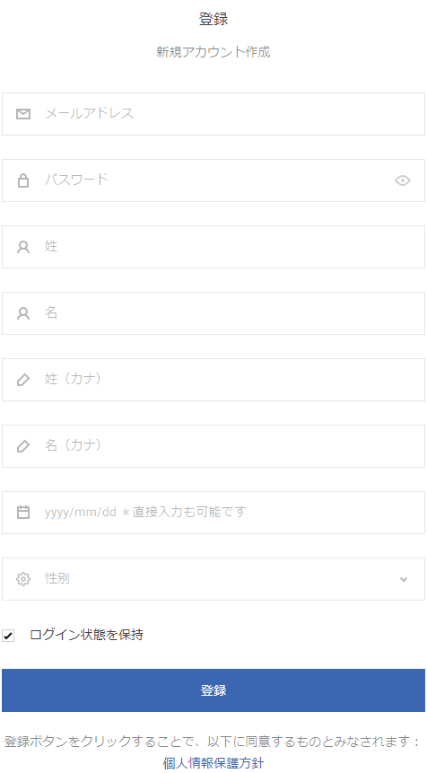 登録画面でメールアドレス、パスワード、姓、名、生年月日、性別を入力して「登録」ボタンを押してください。